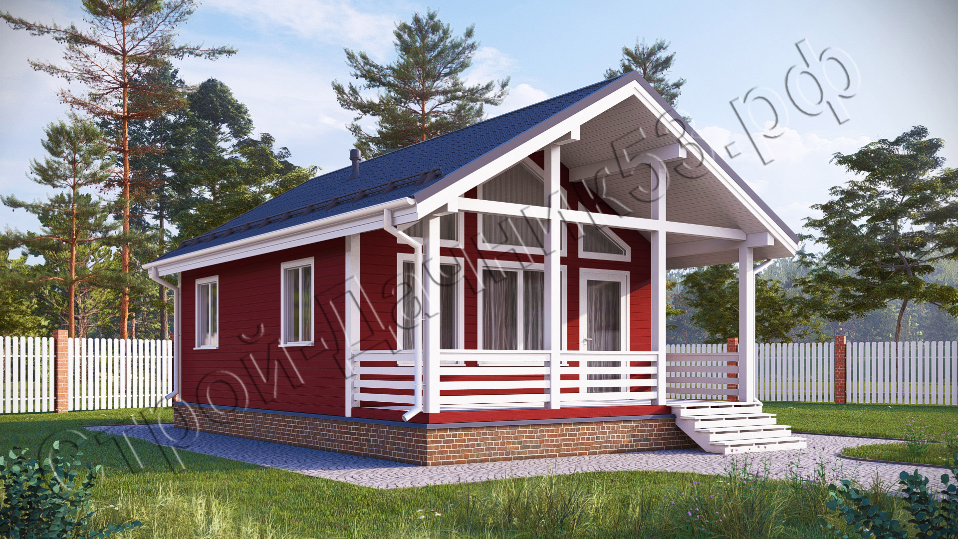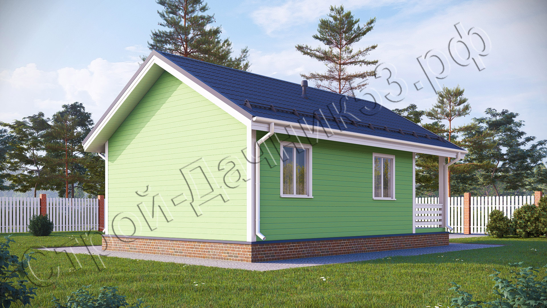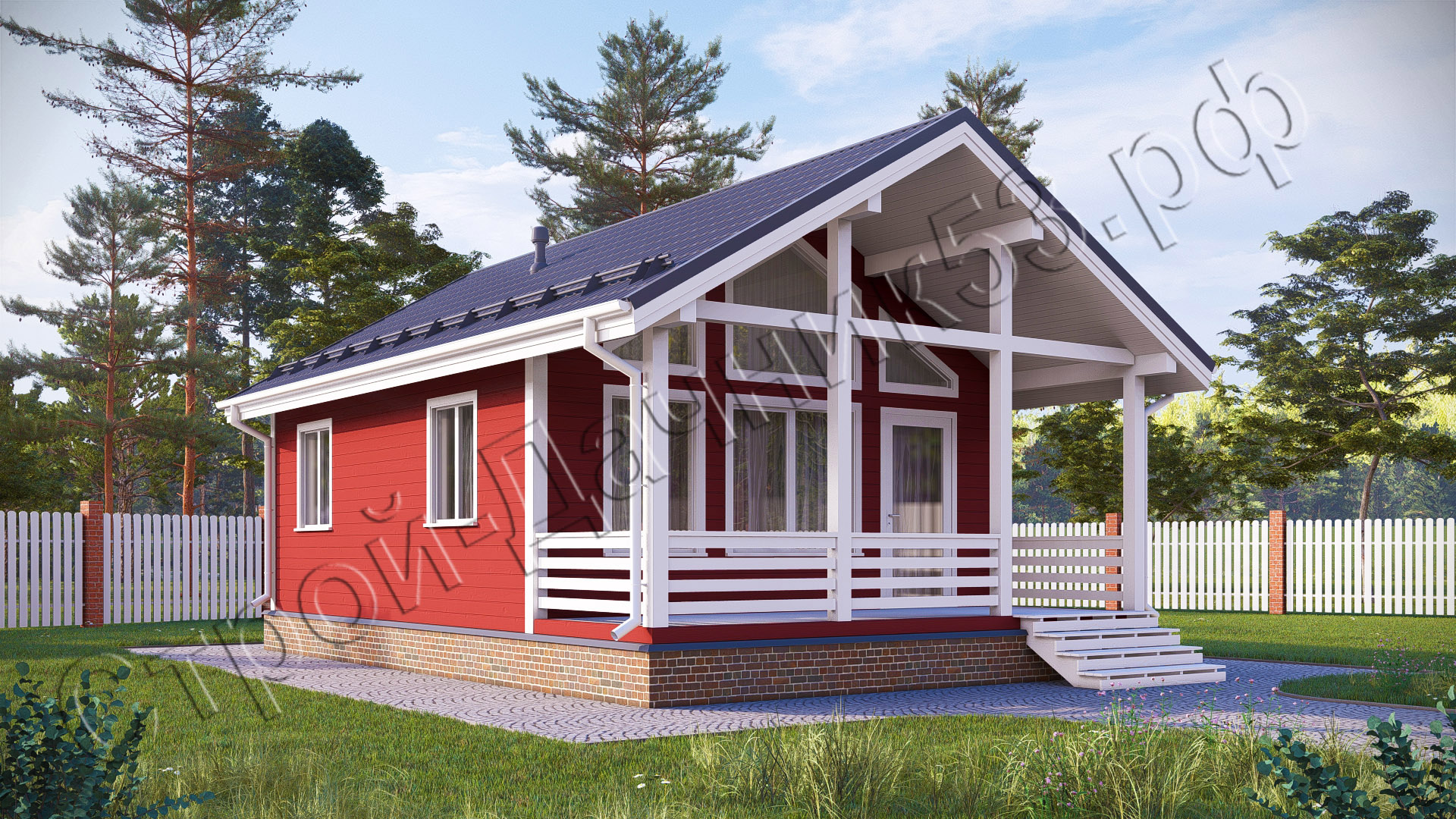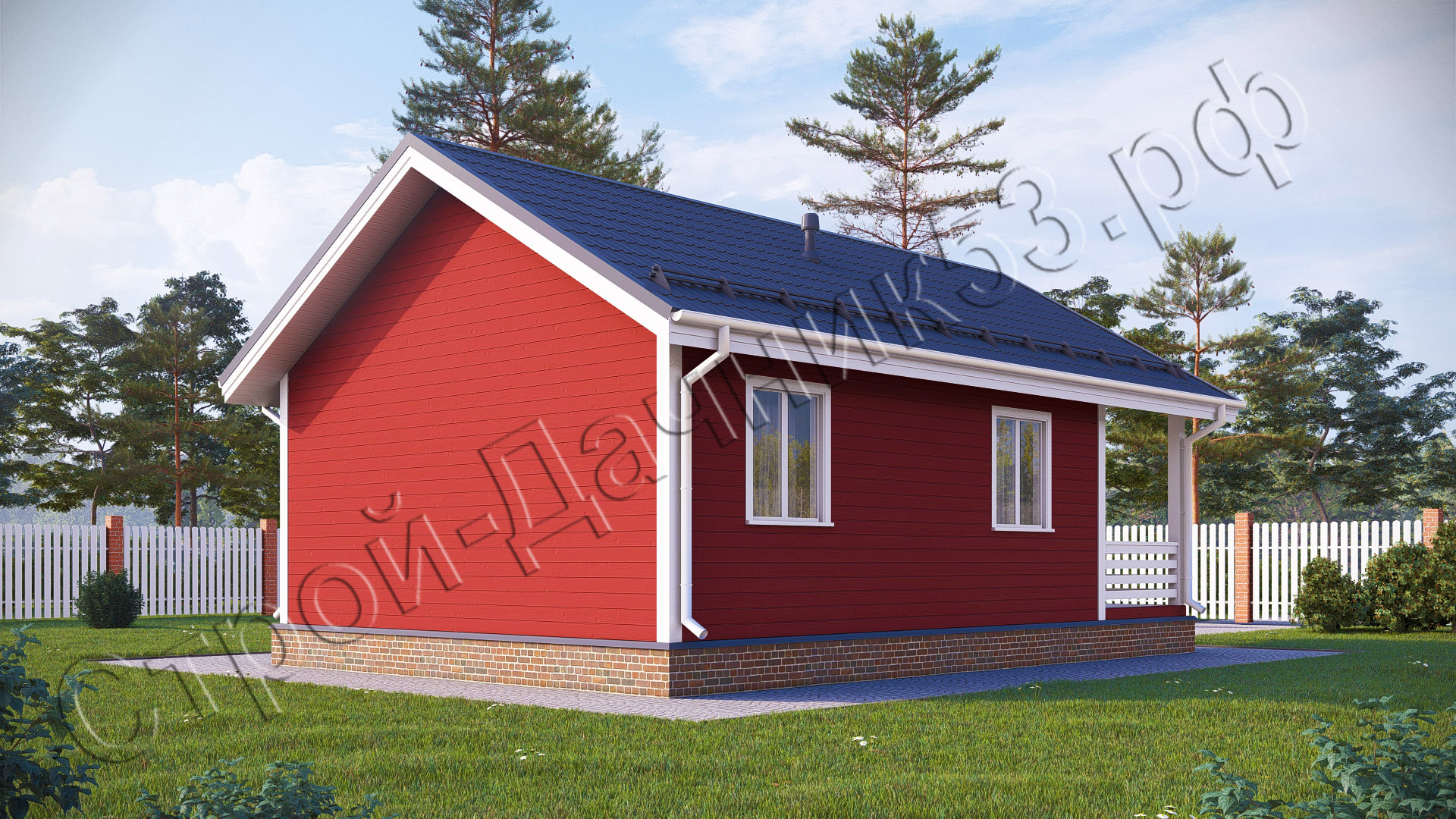 • Это небольшой уютный дом с классической двухскатной крышей для комфортного проживания 3-4 человек. Наличие крытой большой террасы это несомненное удобство для отдыха на открытом воздухе всей семьей. Кухня-гостиная центральный элемент этого проектного решения это самое светлое помещение дома, так как имеет 3 вертикальных панорамных окна а также окна верхнего света. Через кухню-гостиную осуществляется как вход в дом так и проход в другие помещения дома – небольшой санузел и две спальные комнаты.