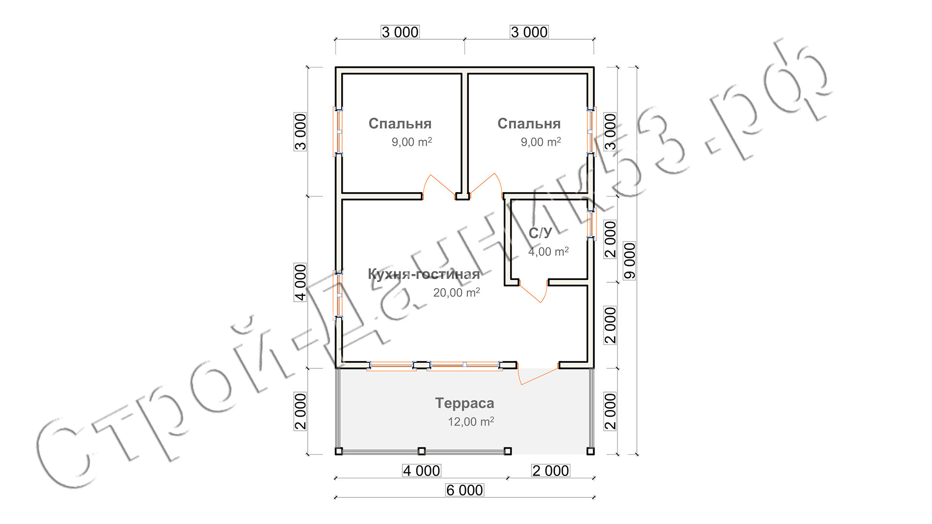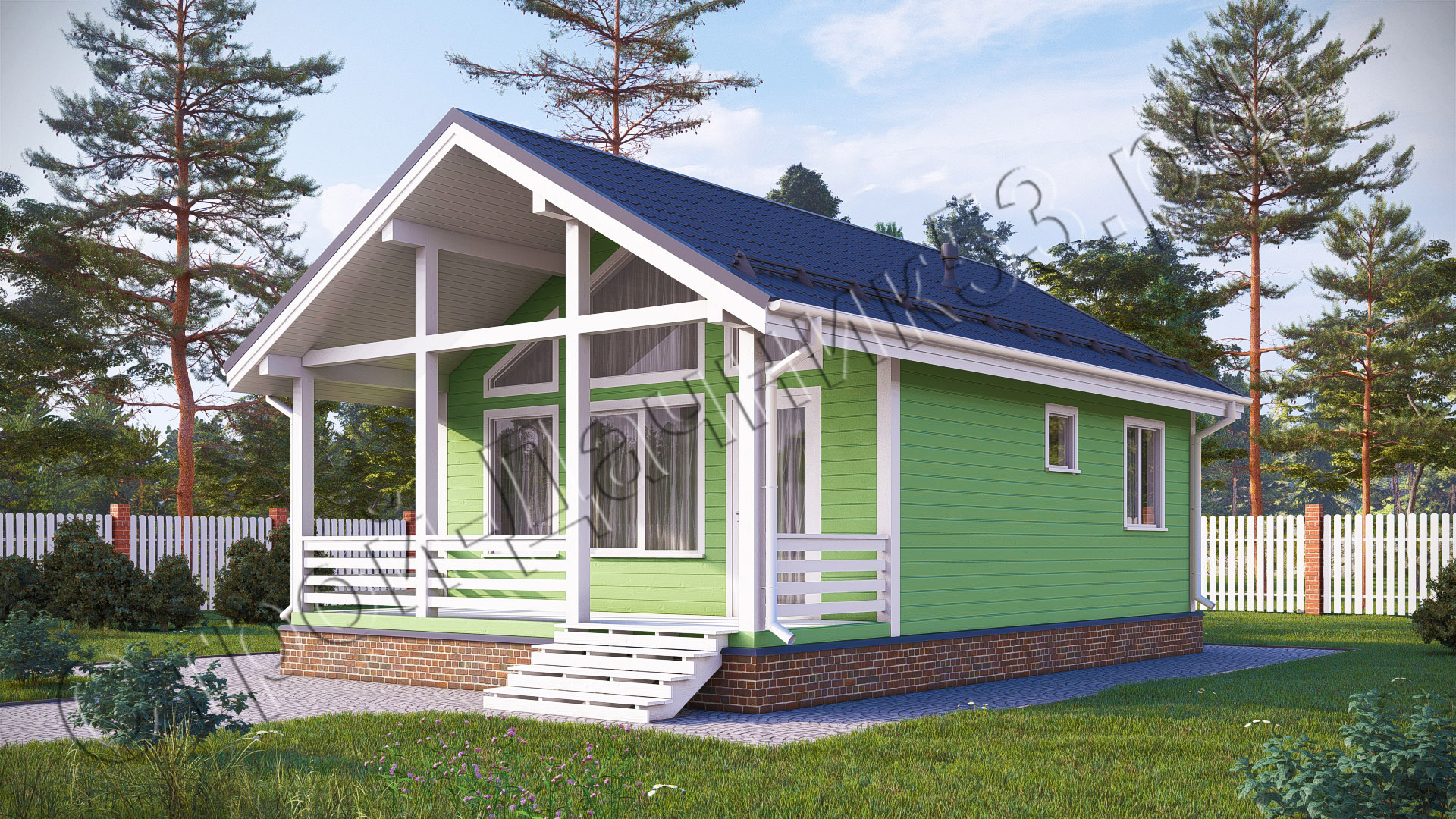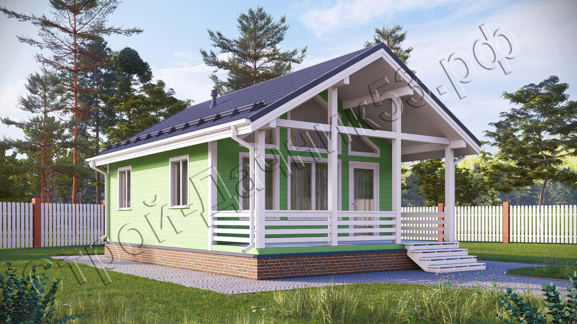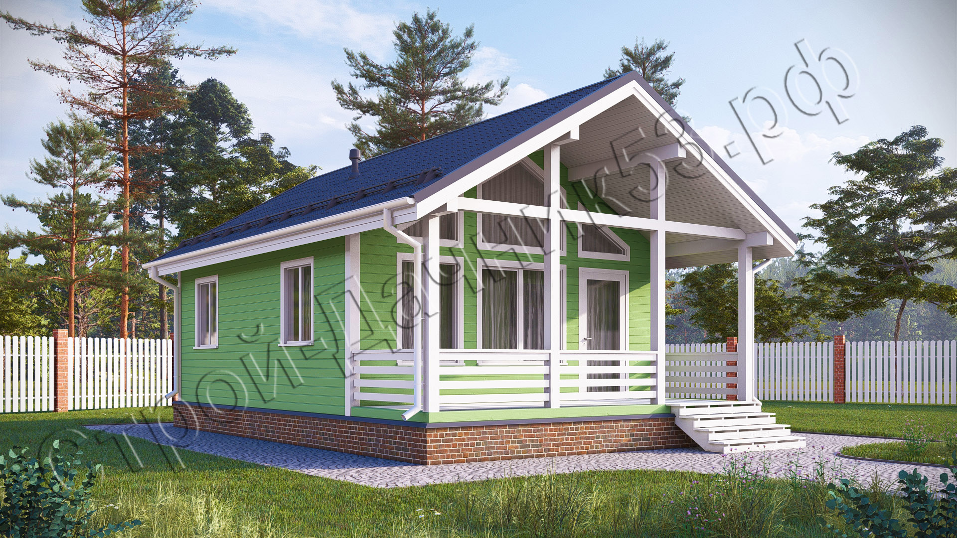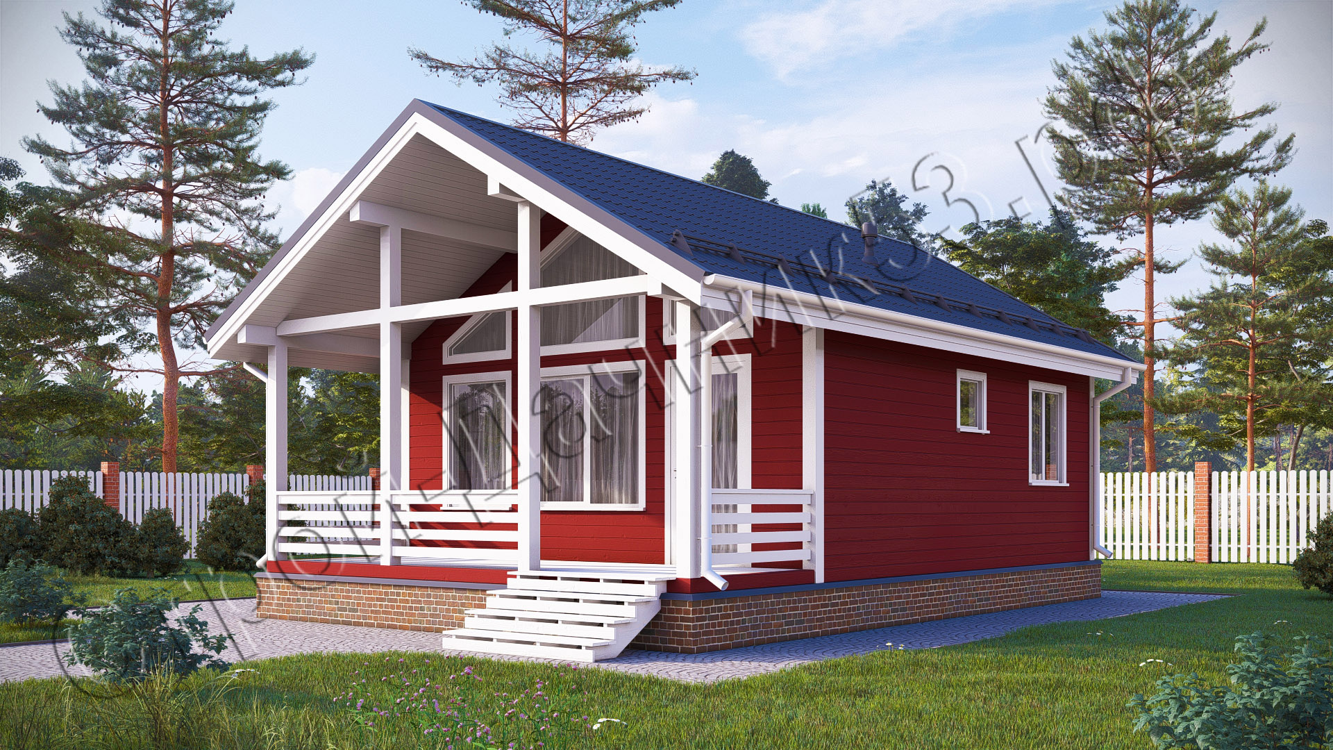 • Это небольшой уютный дом с классической двухскатной крышей для комфортного проживания 3-4 человек. Наличие крытой большой террасы это несомненное удобство для отдыха на открытом воздухе всей семьей. Кухня-гостиная центральный элемент этого проектного решения это самое светлое помещение дома, так как имеет 3 вертикальных панорамных окна а также окна верхнего света. Через кухню-гостиную осуществляется как вход в дом так и проход в другие помещения дома – небольшой санузел и две спальные комнаты.