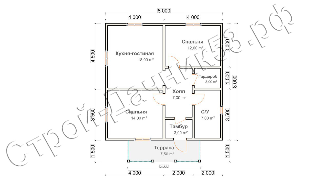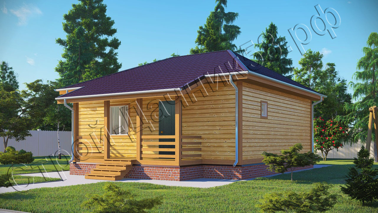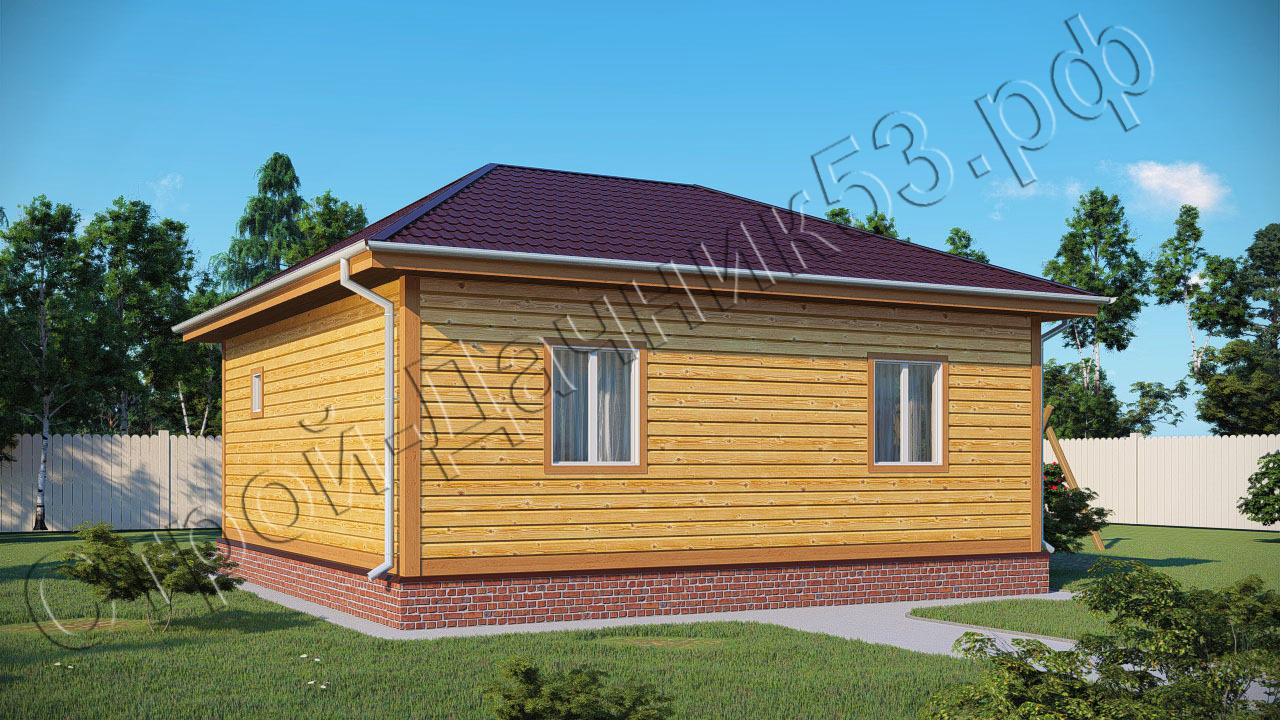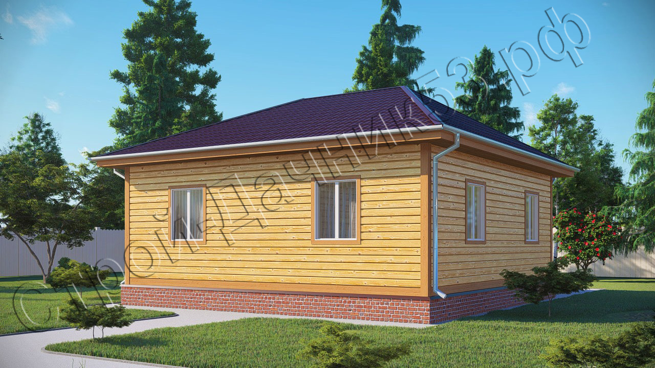 • Дом с оригинальной четырехскатной крышей, периметр стен имеет квадратную форму восемь на восемь метров, что положительно скажется на стоимости квадратного метра, так как у прямоугольных строений этот показатель выше. Проект имеет небольшую двенадцатиметровую террасу при входе, покрытую удлиненным скатом основной крыши. Открытая терраса это хорошее решение для отдыха на природе. Ярким отличием от остальных проектов является наличие отдельного помещения под гардеробную, а также большое семиметровое помещение под санузел, где есть возможность выделить место под душевую и ванную. Дом будет, несомненно, теплым, потому что центральный вход отделен от основного помещения тамбуром, оснащенным двумя дверьми. Из центрального холла, расположенного ровно в центре дома, имеются отдельные проходы в две спальни, кухню - гостиную, гардеробную и большой санузел.
