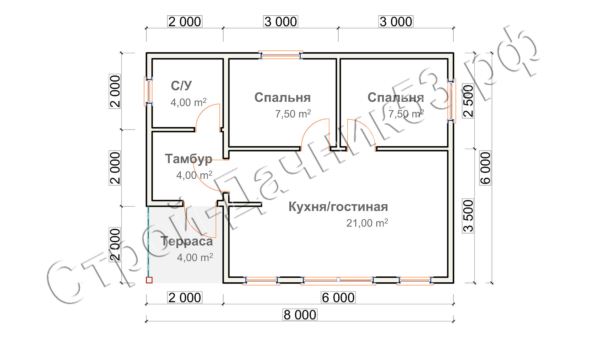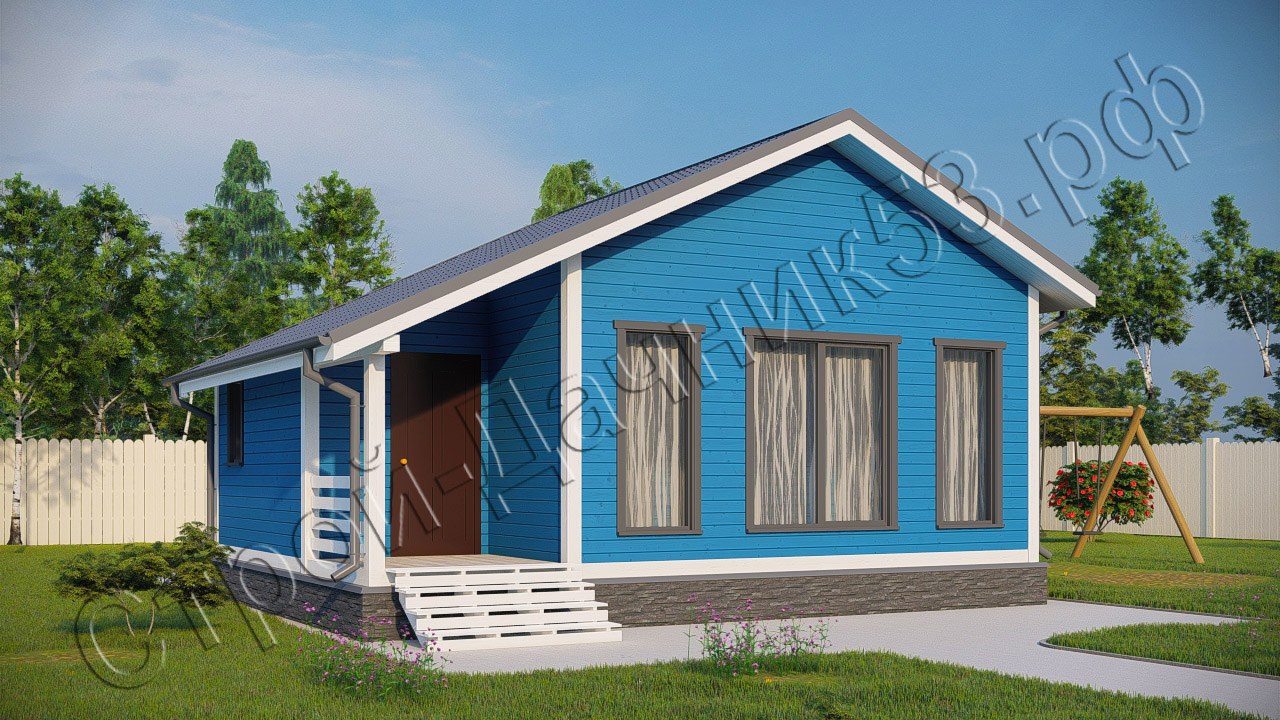 • Представленный Вам проект дома обладает очень светлой кухней – гостиной, помещение площадью 21 кв. м. освещают 3 в полный рост вертикальных витринных окна. Очень правильно и удобно проработана входная группа: перед входом в дом расположена 4-х метровая открытая терраса, что удобно для отдыха на свежем воздухе, входной тамбур отделенный двумя дверьми позволяет сохранять тепло для основного помещения, здесь можно разуться и повесить верхнюю одежду, тамбур также имеет отдельную дверь для прохода в санузел. Проектом предусмотрены две небольшие спальни с отдельными выходами в кухню – гостиную.