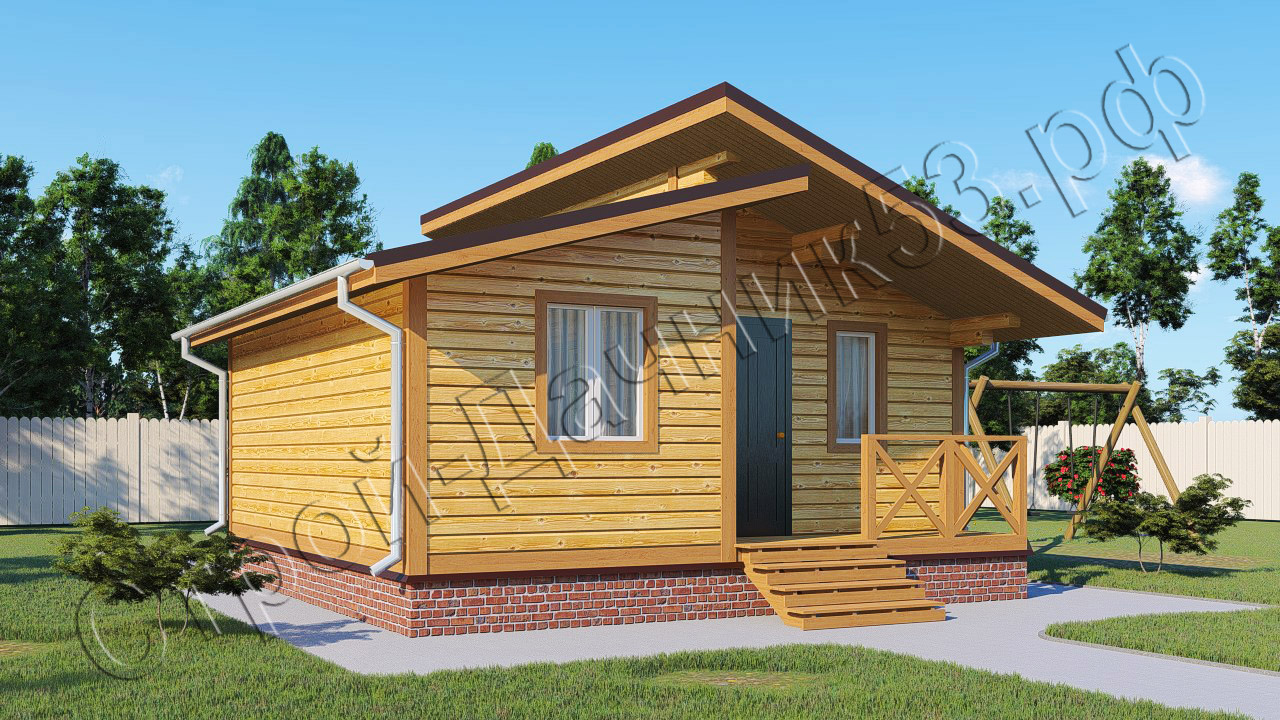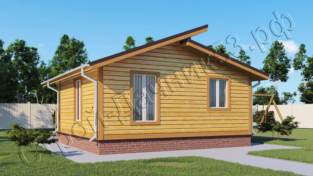 • Дом с оригинальной формой крыши «внахлест», с периметром квадратной формы, подойдет для комфортного постоянного проживания 1-2 человек. Из отличительных особенностей можно отметить наличие входного тамбура совмещенного с небольшим санузлом. Помещение гостиной носит функцию проходного помещения, из которого можно попасть в кухню и спальную комнату. Небольшую входную террасу можно также отнести к достоинствам данного проекта.