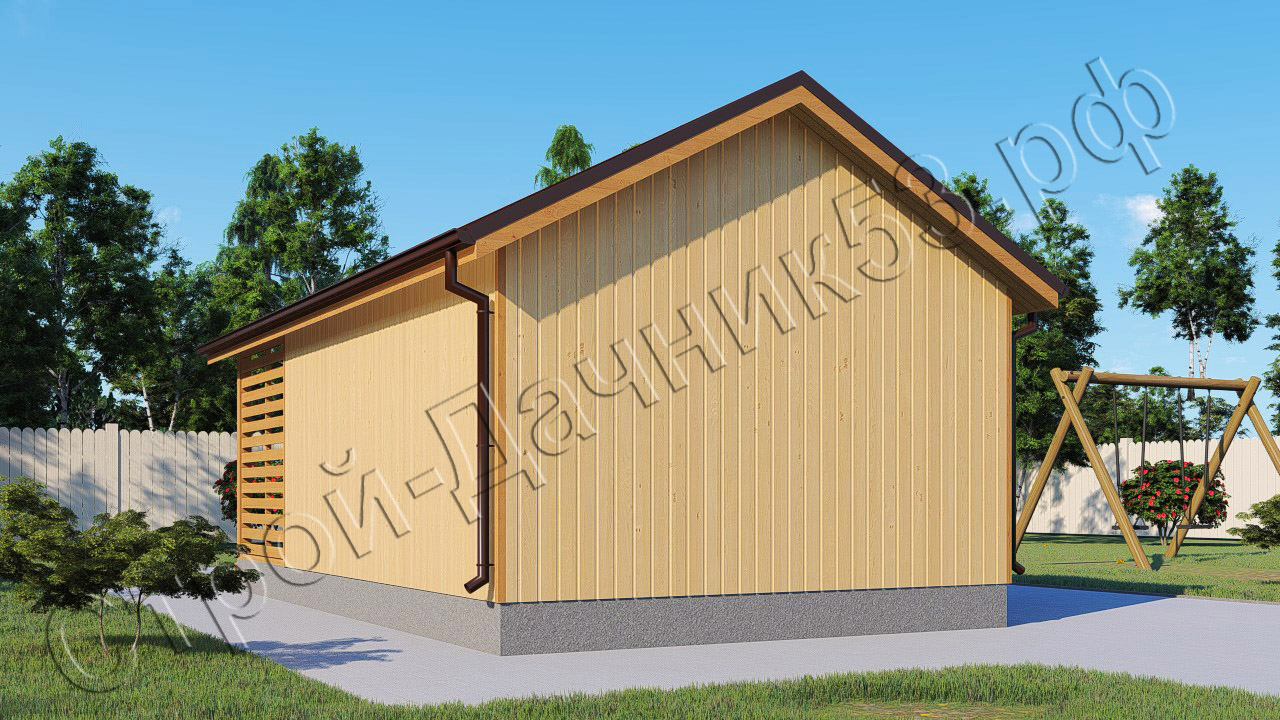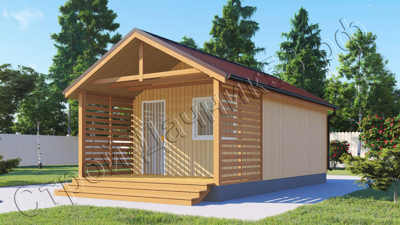 • Маленький дом с классической двухскатной крышей, для комфортного временного проживания 1-2 человек. Дом минимального размера предназначен для дачного проживания так отсутствует помещение для санузла. Большим плюсом и отличительной особенностью дома является наличие большой, во всю ширину дома крытой террасы. Также можно отметить удобный трехметровый коридор из которой ведут два выхода в комнату и кухню.