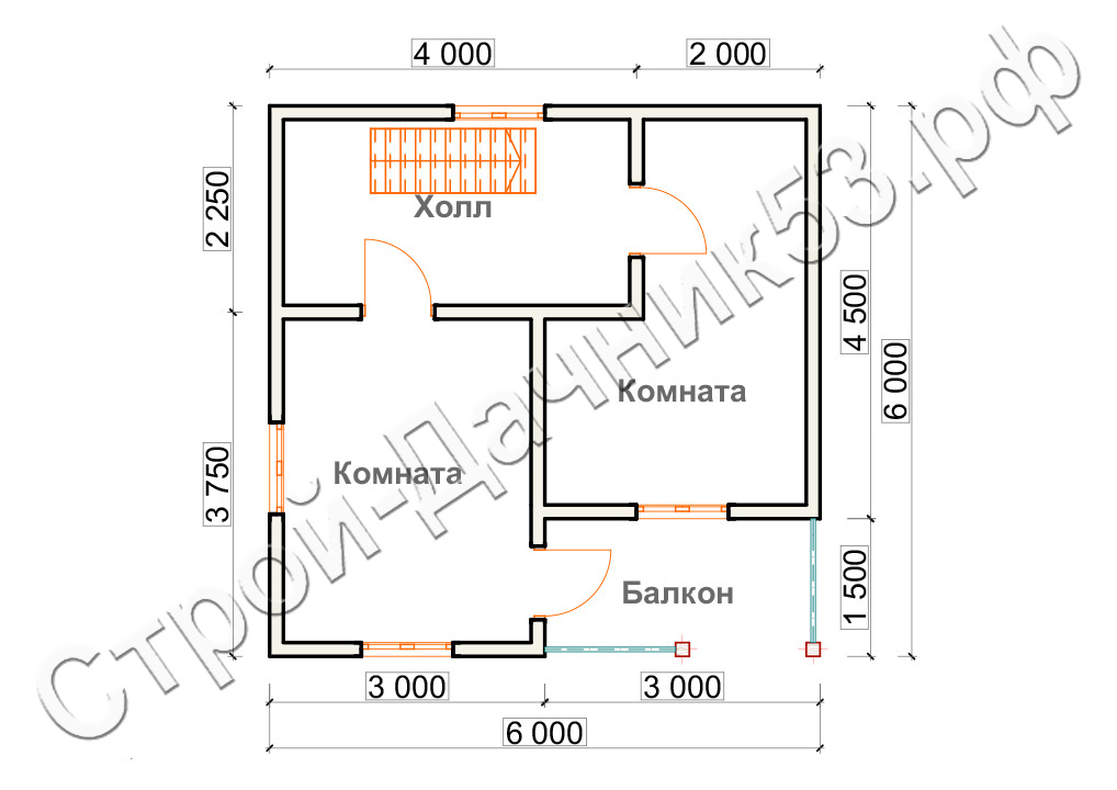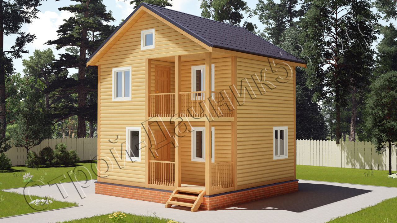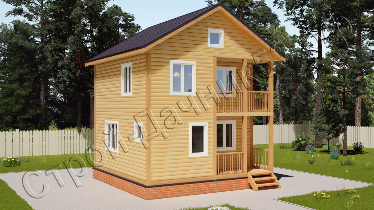 • Это большой двухэтажный дом для постоянного проживания 5-6 человек с классической двухскатной крышей. Из ярких особенностей можно выделить террасу при входе размером 3 на 1,5 метра, над которой расположен балкон второго этажа. Планировка первого этажа включает следующие помещения: входной тамбур, гостиную с лестницей на второй этаж, санузел, комнату и кухню. На втором этаже размещен холл с выходом лестницы из первого этажа, две комнаты и балкон, выйти на который можно из одной из комнат.
